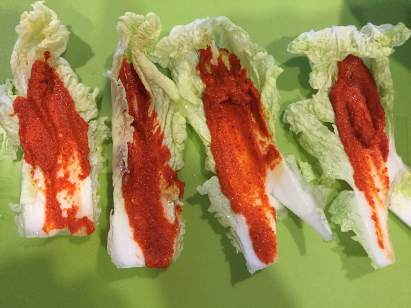Spread each leaf with the Korean paste. The stalks tend to break but this is fine. For smaller jars, you may wish to slice the leaves lengthways to make thinner parcels.